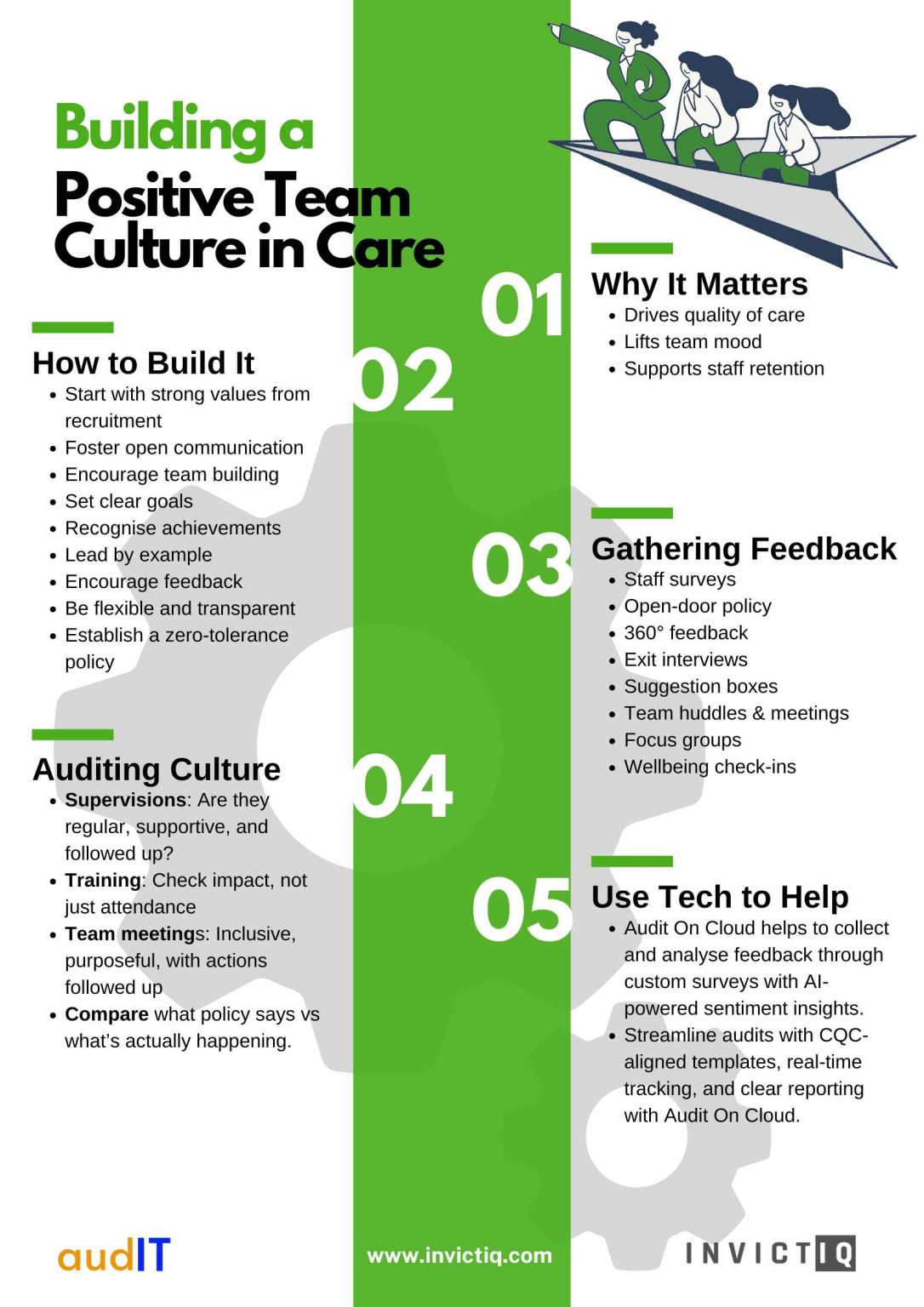 As mentioned above, team culture can help drive the care being delivered, the mood within the service and supports the retention within the team and it cannot be a nice to have, but an essential part of the business. There are many resources available online to support a strong team culture, but studies have shown that staff who feel more connected to their work boosts engagement, increases communicate and ensures effective collaboration. Whilst the online resources are useful, I would recommend that you speak to your team to seek their feedback on what is working well and what could be improved or changed.