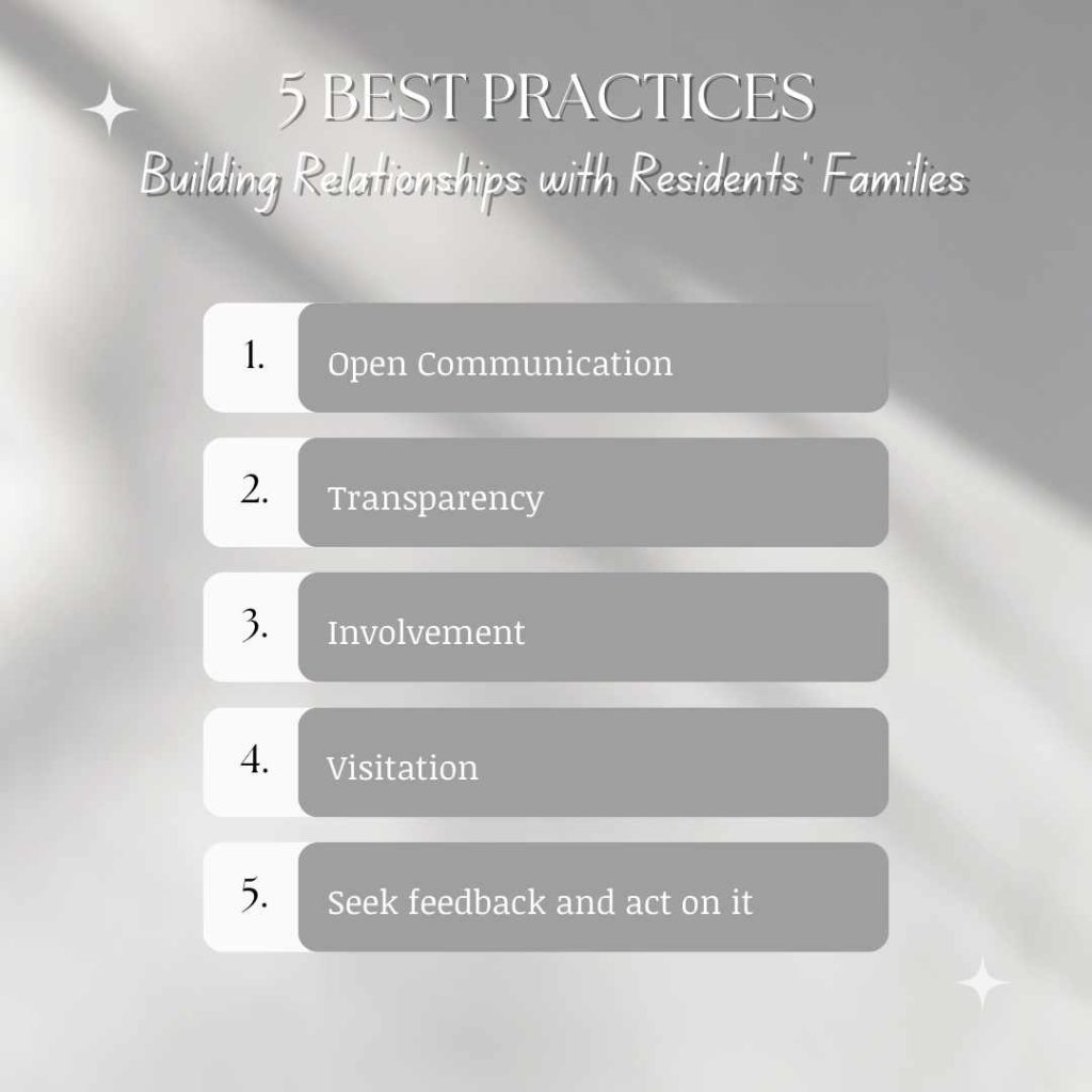 - Ensure you speak to relatives when they come to visit their loved ones, even if it is to say hello and ask how they are. Showing your face and engaging will go along way.