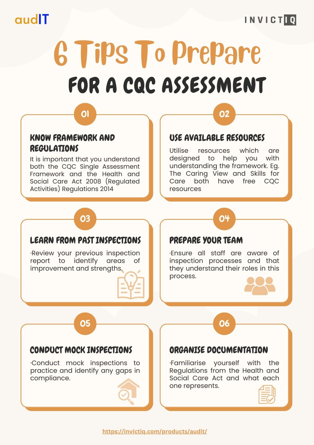 A. Preparation is key, and in order to prepare yourself and your team it is important that you understand both the CQC Single Assessment Framework and the Health and Social Care Act 2008 (Regulated Activities) Regulations 2014. Here are some tips: